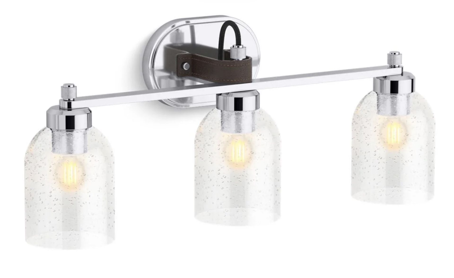 Brand new Kohler Three-Light Wall Sconce. Model:K-38418-SC03-CPL Tannage 6 1/8 Inch Color: Polished Chrome Retail price: $368 plus tax Dimensions: Height: 10-1/8" Width: 24-1/2" Extension: 6-3/16" Bell-shaped shades in seeded glass combine with exposed cording, knurled metal, and a tanned leather strap for a modern industrial yet refined feel Requires bulbs with medium (E26) base; type A19 bulb recommended (sold separately) Suitable for damp locations, per UL 1598 Includes installation hardware Fixture is dimmable when paired with dimmer switch and compatible bulbs