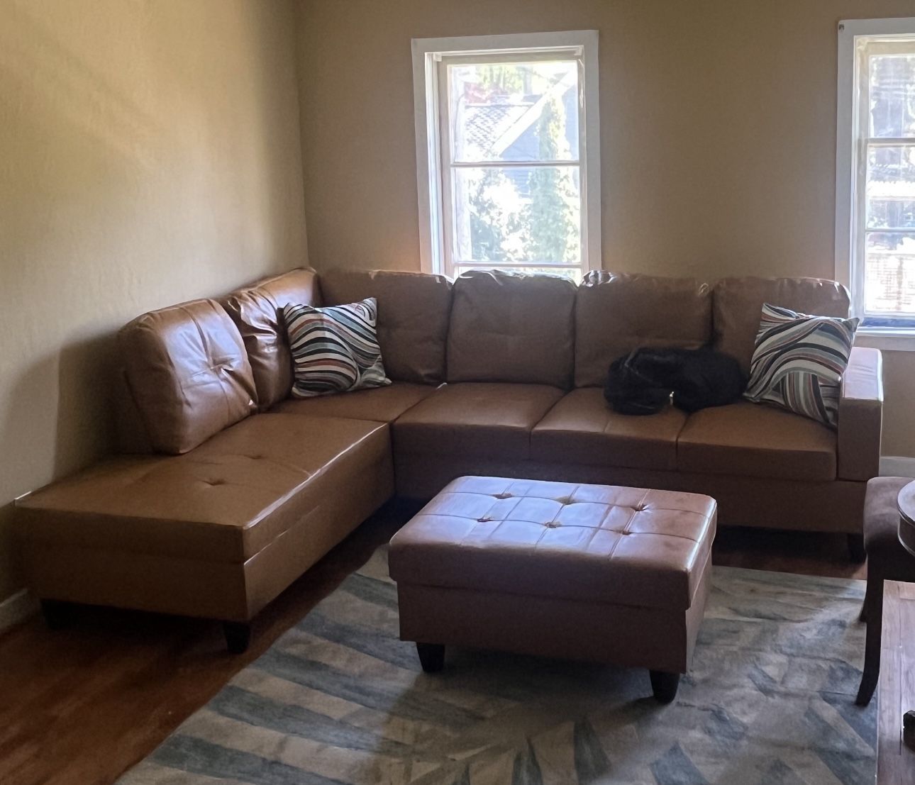 Sectional sofa couch and ottoman Brand new still in packaging this is display picture with decorative pillows and storage ottoman included Delivery to all areas