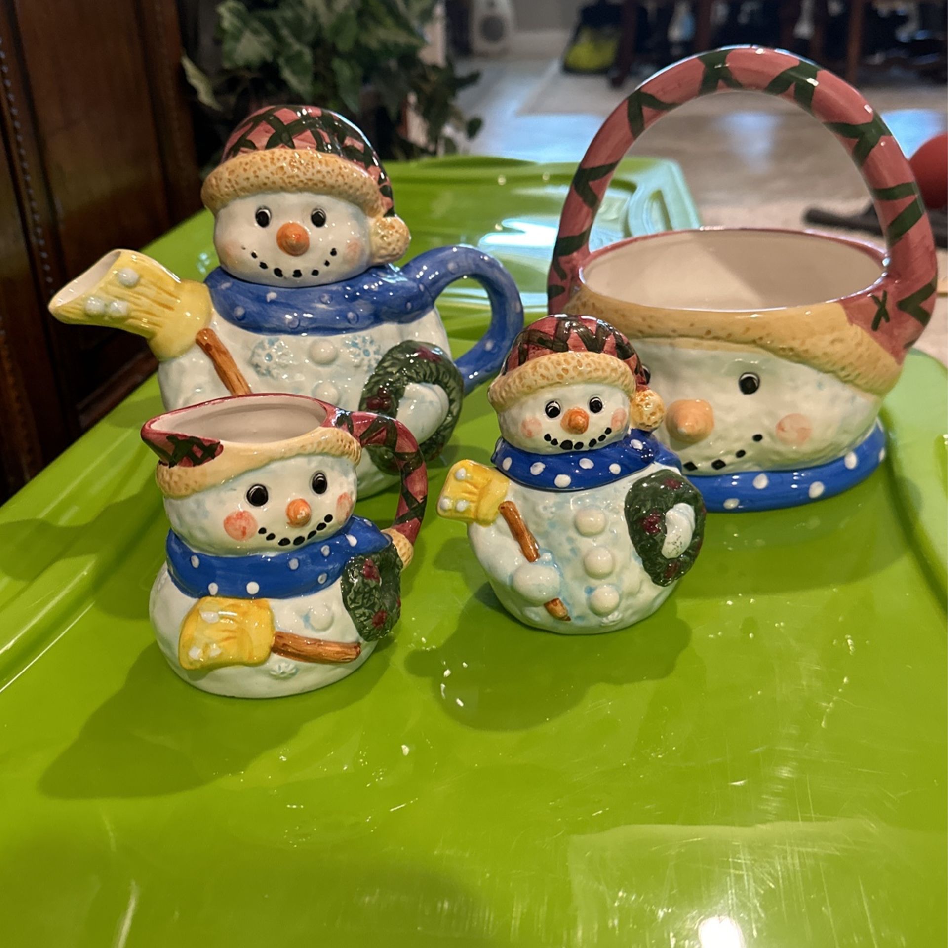 Snowman Tea set -creamer/sugar and basket Ceramic No chips