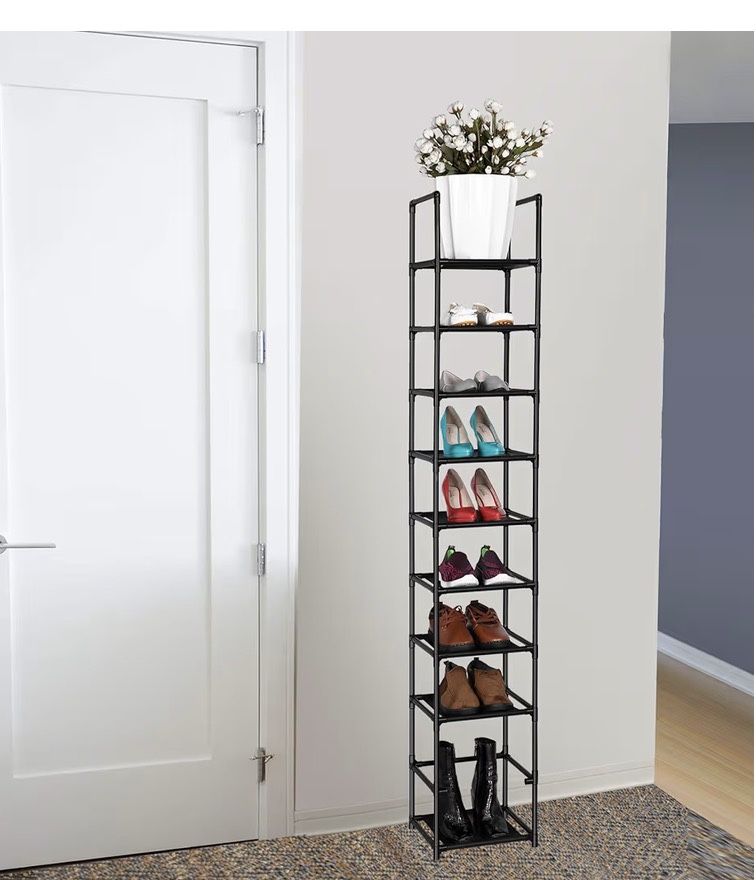 New in box Tiers Shoe Rack Space Saving Vertical Single Pairs Sturdy Shoe Shelf Storage Organizer Located off pleasant st riverside ca 92507 Serious buyers only Cash only MATERIAL & STRUCTURE: Made from Durable waterproof non-woven fabric tiers , Strengthened plastic connectors and thickened iron pipes. Short design of shelf pipes are hard to bend even put larger & heavy objects, that makes this rack sturdier, stabler and longer lifetime. STORE CAPACITY: 10-tier rack can hold up 10 pairs of adult shoes, each shelf hold 1 pair, much more space saving. You can remove one layer to fit boots, high heels. This rack is not only for shoes, but also for tiny things, such as CD, toys, towel, sundries, books, plants and small accessories. MEASURES: 11"L x 11"W x 68.8"H, perfectly storage for your closet, entryway, dormitory, apartments, garage, etc. EASY ASSEMBLY: No tools needed, simply assemble the unit by hand with provided parts, quickly and brings you great convenience. You can also separate it into 2 5-tier racks.