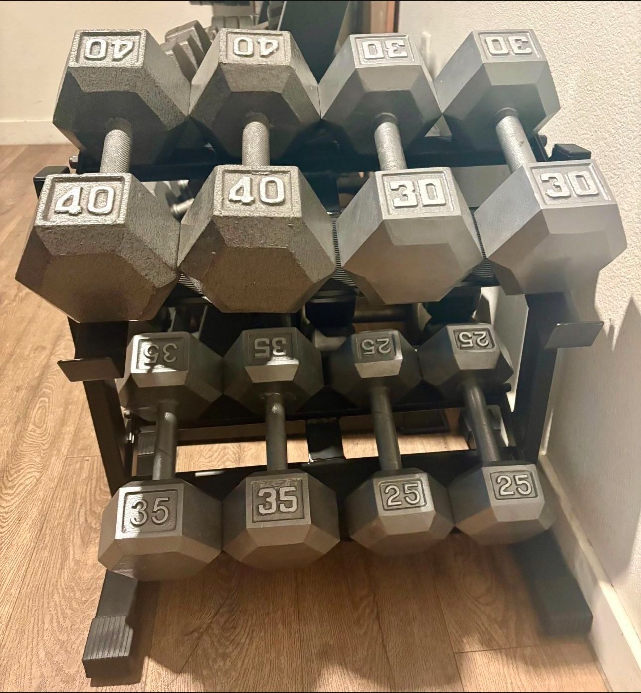 RACK NOT INCLUDED This is Basically NEW ( Reconditioned) see the pictures for yourself. (2) hex dumbbell 40 lbs (2) hex dumbbell 35 lbs (2) hex dumbbell 30 lbs (2) hex dumbbell 25 lbs Total: 260 lbs If you need lower price. Look for the rusted/beaten ones (other sellers) . Thank you.
