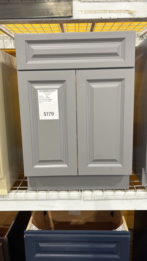 BATHROOM VANITY Grey Raised Panel 24'' Wide Drawers: N/A Vanity Type: Cabinet Box Construction: Plywood Door Construction: Wood Price: $179