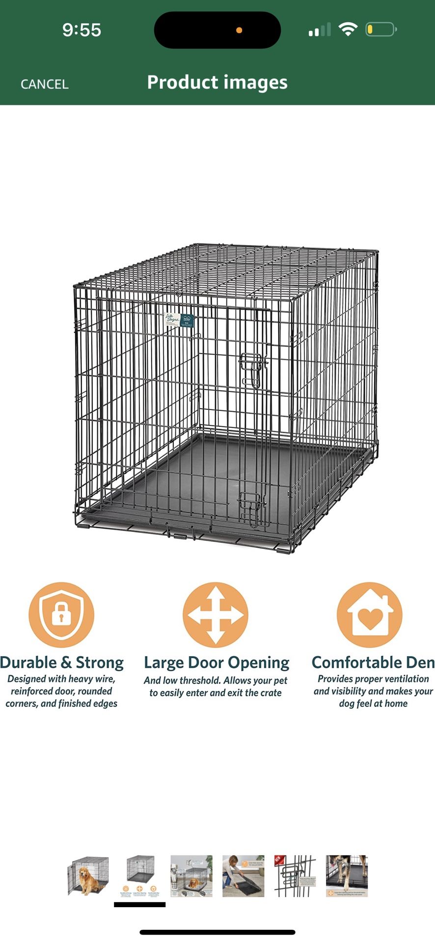 Large crate with divider used a month or less bought in Amazon for $109. Foldable Like New