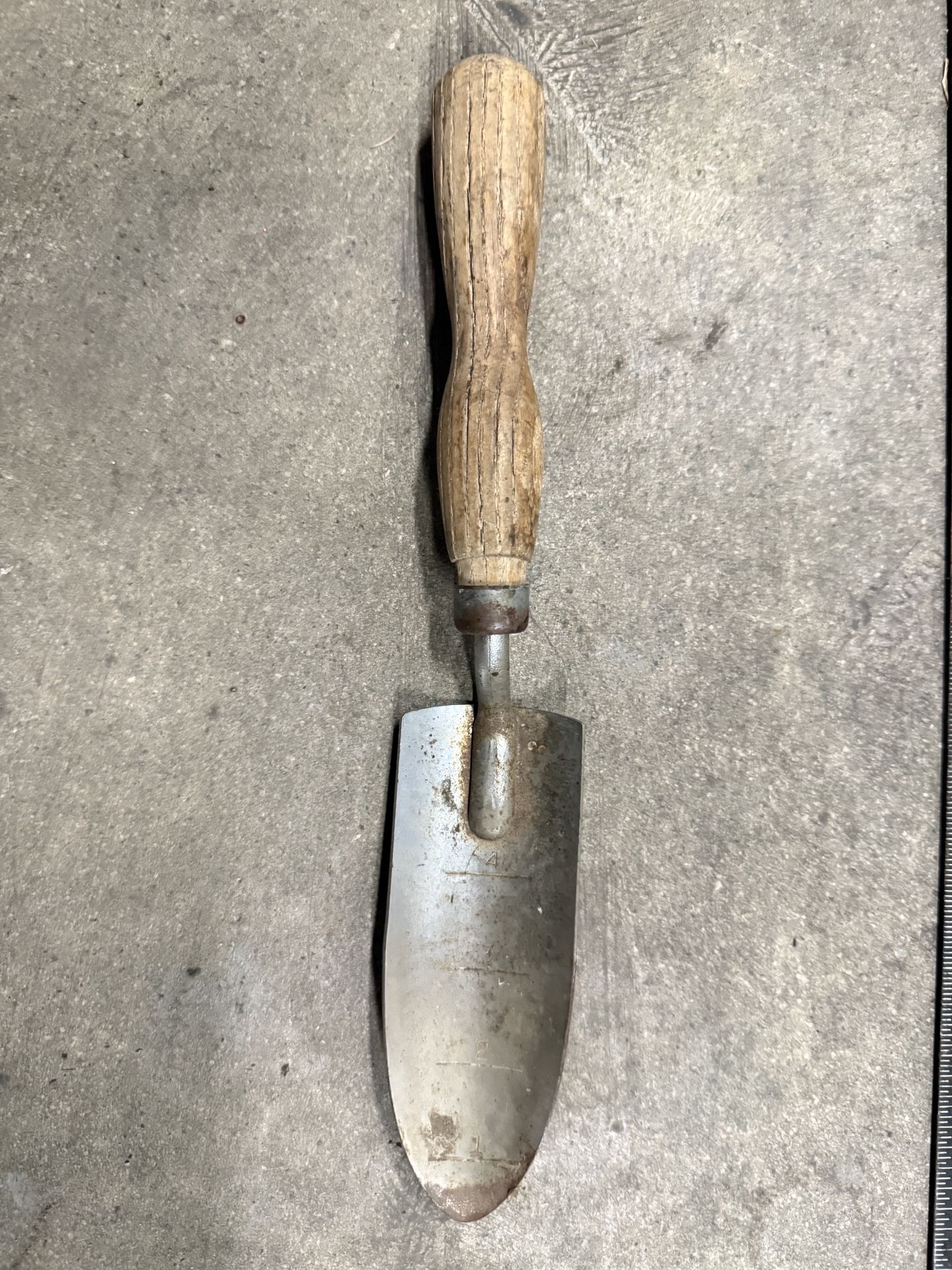This is a hand garden trowel with a wooden handle. It is a heavy-duty, forged steel tool designed for digging, planting bulbs, and transplanting. The ergonomic hardwood handle provides a comfortable grip. The blade is made of metal, likely steel, and has a pointed end for easier soil penetration.