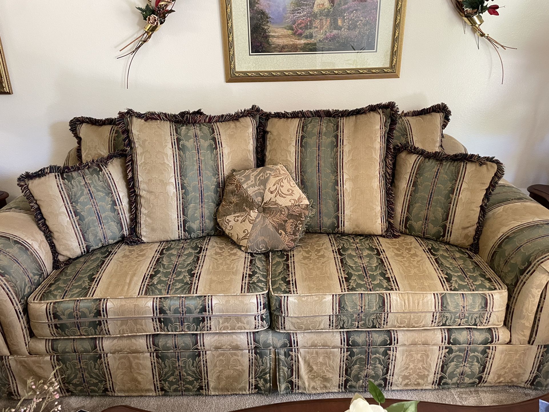 Tan/Gold, Forest Green, And Burgundy, Approximately ‘3x6’. Includes the couch and the six pillows which are included in the photos. Barely used and is in good condition and comfortable to relax on. Only serious offers please.