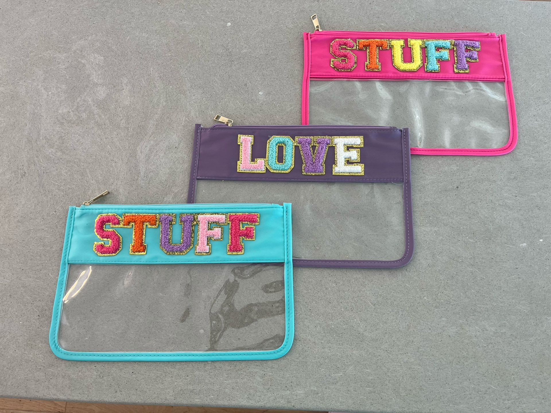 Sold separately. Message color you’d like. Medium Size bold color plastic cosmetic bags in Aqua, Purple, and Hot pink! You can fill these bags with cosmetics, snacks, or random items for storage and organization. Get creative!
