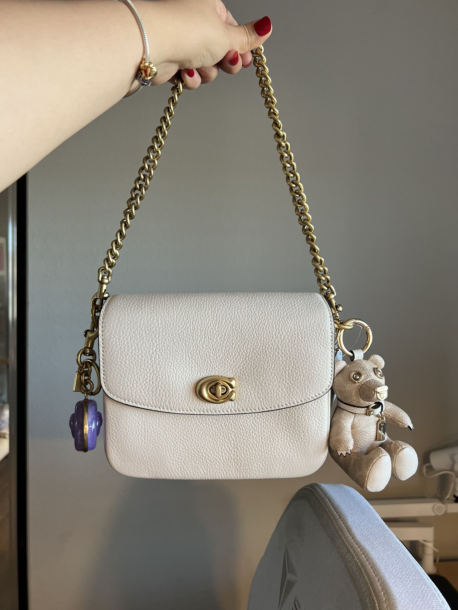 Coach Cassie 19 crossbody bag in chalk brand new. It comes with all three straps. Gold brass chain, short strap, and crossbody straps. CHARMS NOT INCLUDED. #coach #cassie19 #coachy Style Number CV437 Measurements Length: 7.75" Height: 6.25" Width: 3.25" Materials Refined pebble leather Fabric lining Strap Detachable short strap with 4" drop Detachable chain strap with 9" drop Detachable strap with 21.25" drop for shoulder or crossbody wear Features Outside slip pocket Inside zip and multifunction pockets Turnlock closure Editor's Notes A more compact Cassie, our 19 is smaller than the original and made for days or nights on the go. The polished pebble leather design is finished with a Signature turnlock closure and three interchangeable straps for versatile styling. Detach the crossbody strap and carry by hand with the leather and chain top handles together or separately.