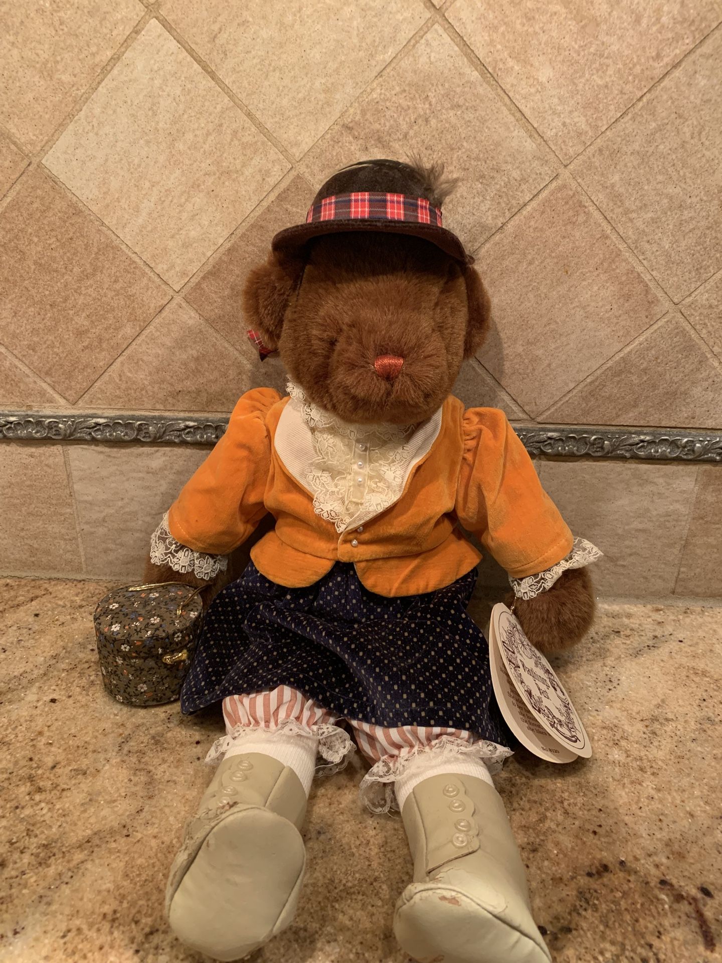 This 18-inch vintage girl Teddy plush bear from Gund is a delightful addition to any collection. With its Victorian-style dress and charming features, it's perfect for lovers of all things vintage. The bear is a vintage 1983 Molly from Gund Playthings Past. Number 8120