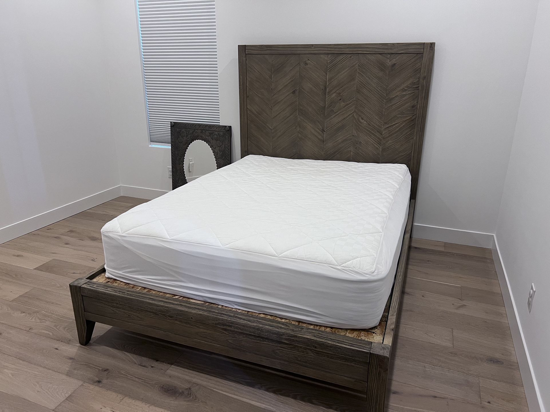 Magnolia home queen size bedframe with Sealy mattress (mattress protector and pad included). Added plywood boards to make it more secure. Matching framed mirror included. Barely used but have had it for a while.