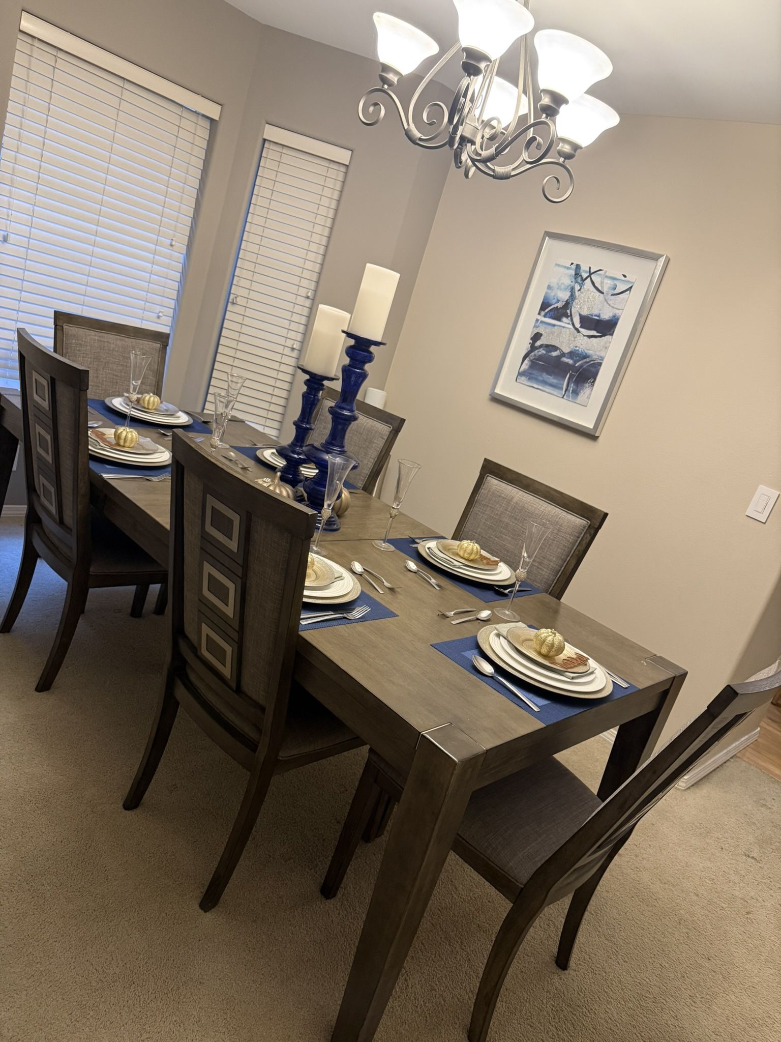 Dining set grey color. Have 6 chair and the table is expendable. Brand Ashely