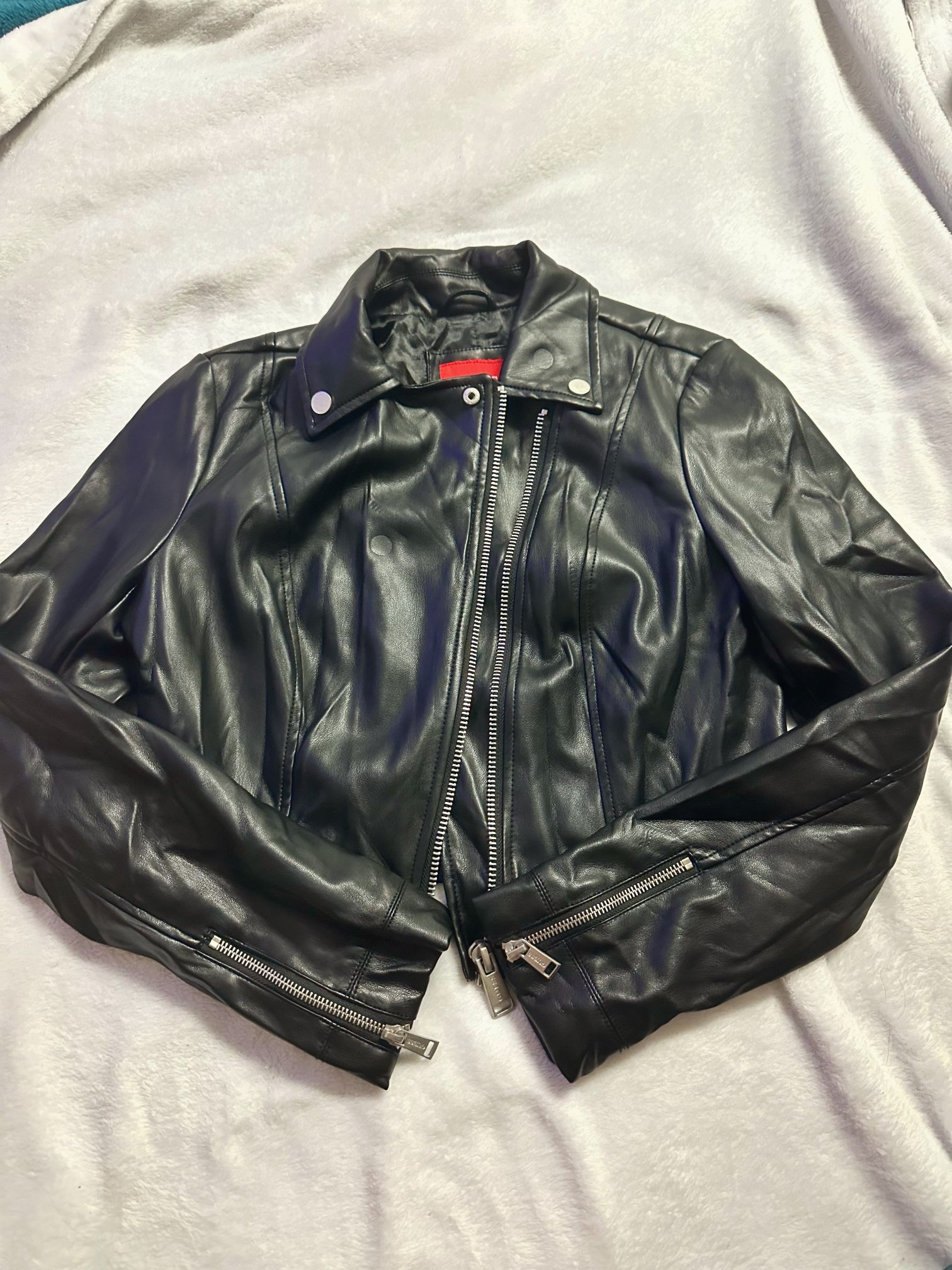 Leather like material Super cute a stylish Very flattering, cropped fit Zipper closure with zipper detail in the sleeves Never worn!