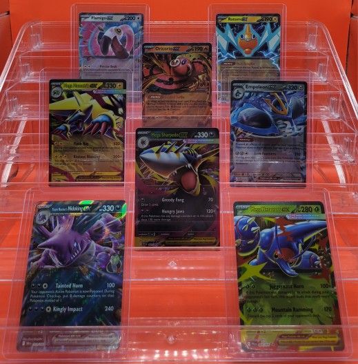 Hello I am selling my freshly pulled immediately sleeved/top loaded, Pokemon Ex Bundle [8 Cards] all cards are Near Mint or better! Sleeves and top loaders included in purchase. [Card stand not included] $12. Pickup in Kent Want confidence in your Pokemon trading card purchases? Buy from an experienced high graphic corrugated containerboard/CNC operator here! Cards are inspected in depth for: U bend, N warp, cardboard layer separation, dents, creases, scratches both light and heavy, knicks, card discoloration and dirt/stains. One of the best ungraded card sellers you will find! Thank you for looking!