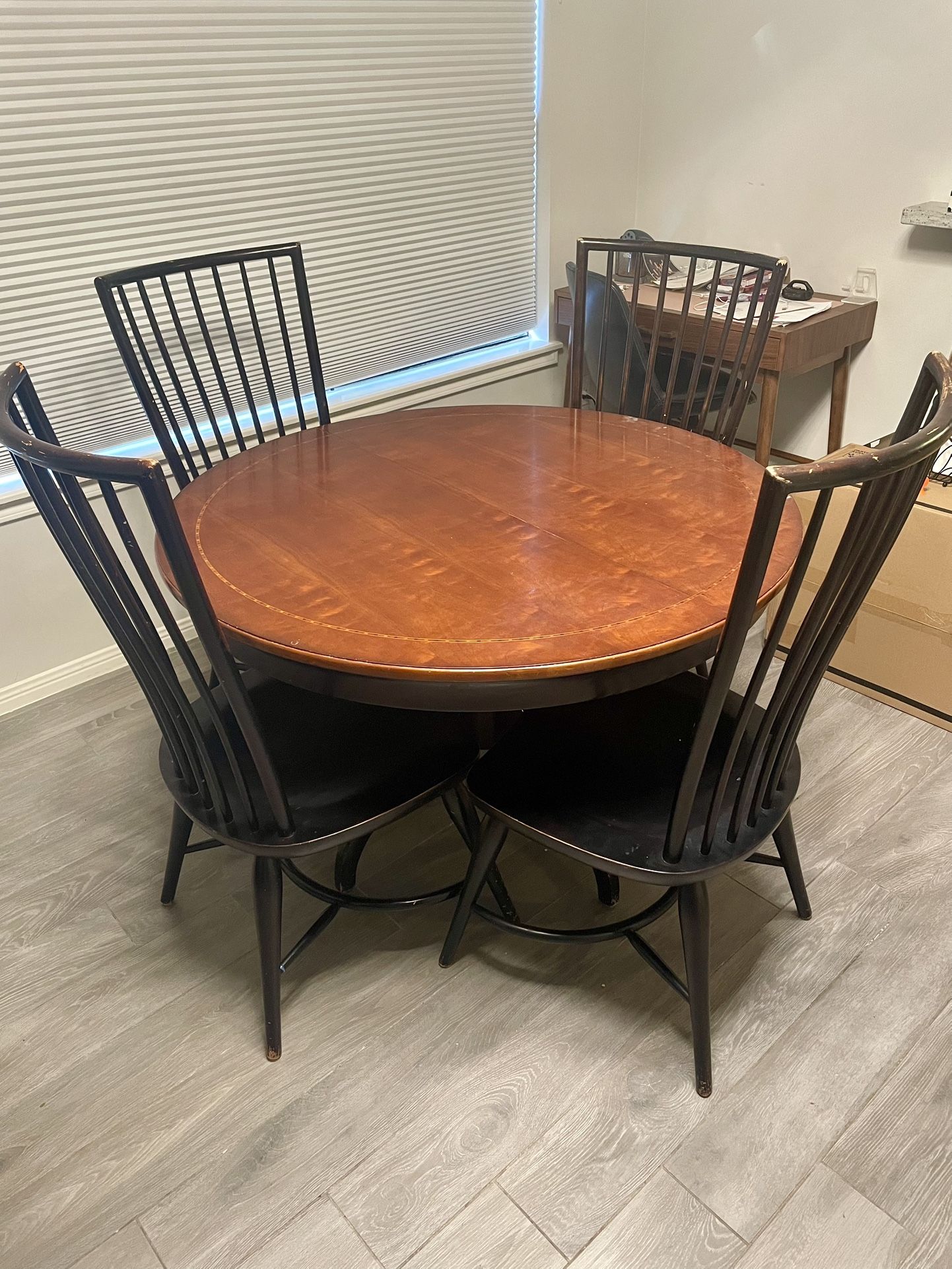 Round dining table and 4 chairs. Good condition. One of chairs needs minor repair in wood