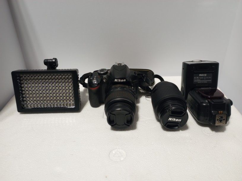 Great shape 3 batteries and dual USB charger Two lenses 18 to 55 mm and one 55 to 200mm Also has 3 digital couplers 12/20/36mm couplers 1 led video food light model LD-160 and 1 Meke speedlight flash model number mk910 6 volts 1 stereo microphone RW-109 Rowa Japan Also 2 remote controls and timer remote switch For time laps long intervals model RST-7006 Comes with other accessories you can see in the picture Also comes with custom backpack camera bag with custom dividers