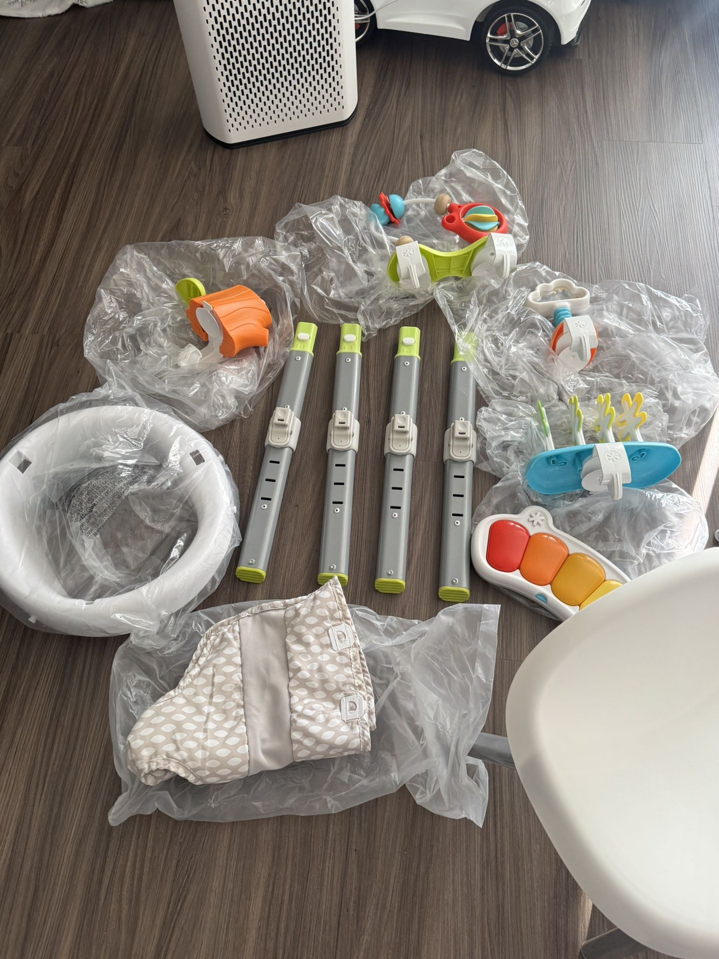 This activity center is in great shape and in good condition. It has normal use, but it is not heavily used. All parts are complete and fully functional. The activity center shown in the photo with the yellow bowl did not originally come with it when we bought it—it seems that the parts of the activity center may vary depending on the purchase. The good thing is that the two seats are already included for free, even though they are not included when you buy the activity center separately—you would have to purchase them separately. If you are not too picky about used items that are still in good condition, this is a good option for you and will help you save money. It is perfect for your baby to play and explore. You can search the product online; I know this is a popular item. Smoke-free and pet-free home