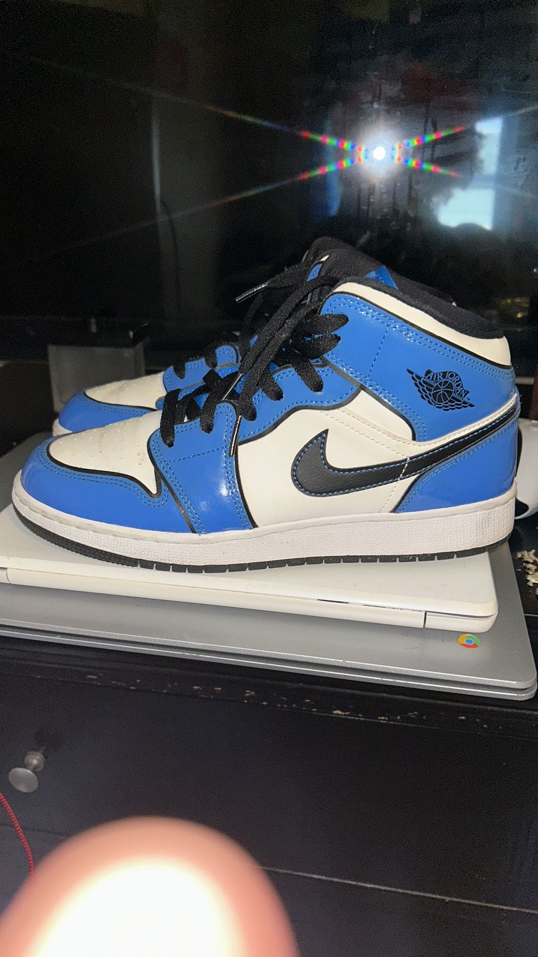 Experience the iconic style of Jordan sneakers with these blue and black high-top classics. Featuring a sleek design with a bold color combination, these sneakers offer both comfort and a timeless look. Perfect for making a statement on any casual outing. Been worn 4 times to the gym.