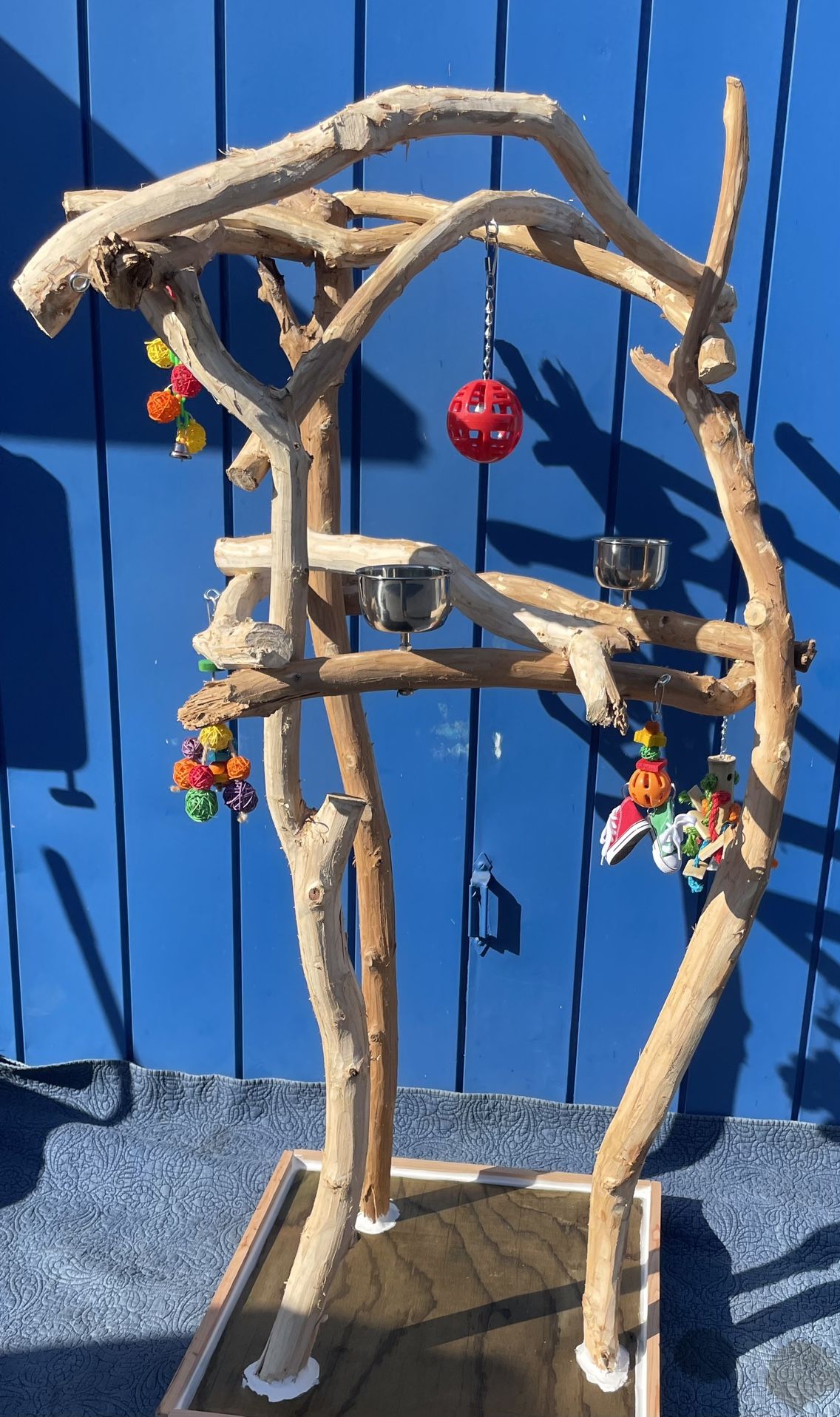 Custom made parrot perch tree, extra thick model for macaws … dual level approx 5.6’ plus tall on a space saving 26”x26” base , on casters … great for those with cats dogs or lil kiddos … Keeps the bird up and out of reach …bowls included … breeder direct light pricing ( wholesale ) 2x = price retail … can deliver or meet up …