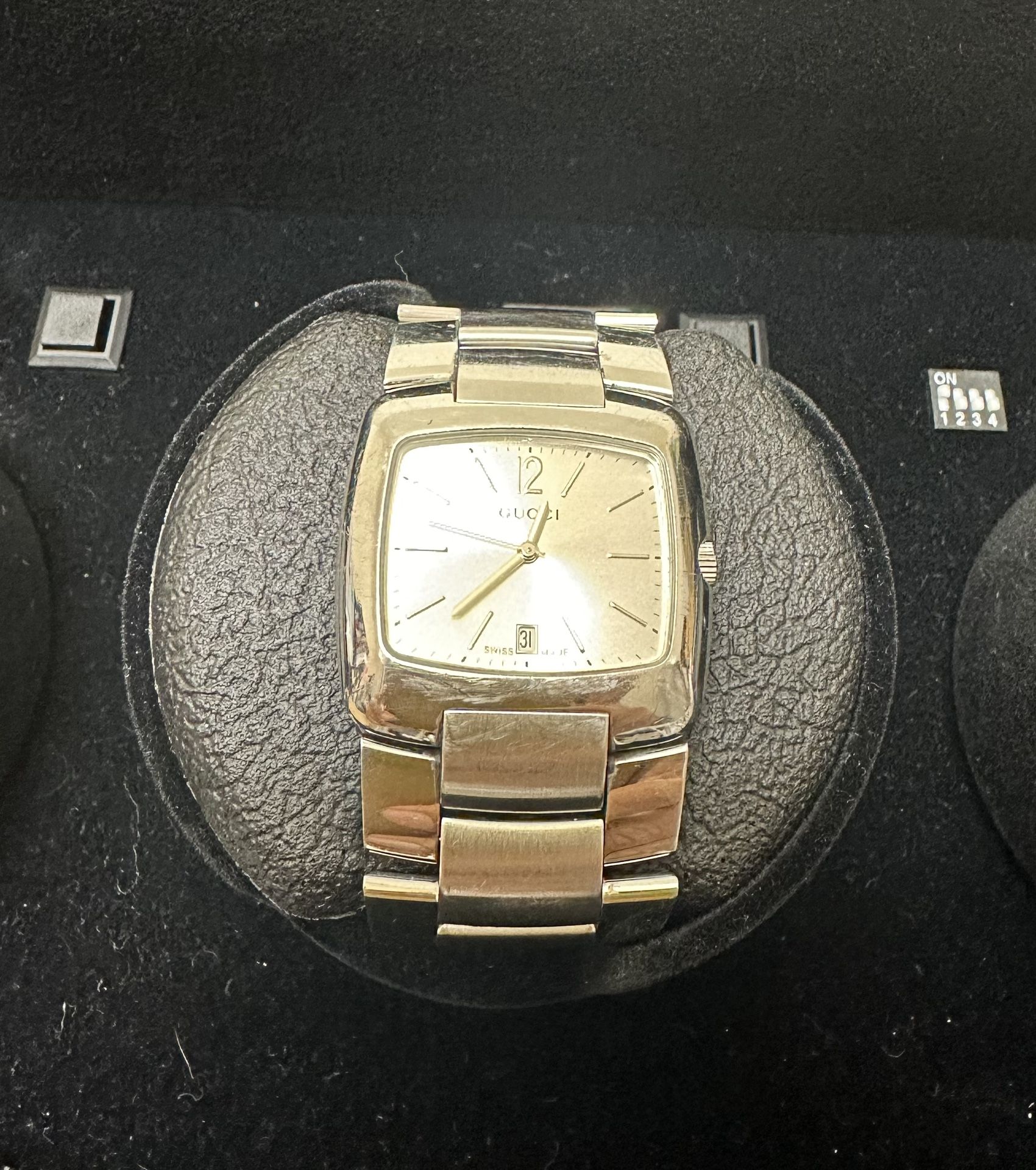 Elegant Gucci timepiece will enhance any look. Silver band and face with date display.