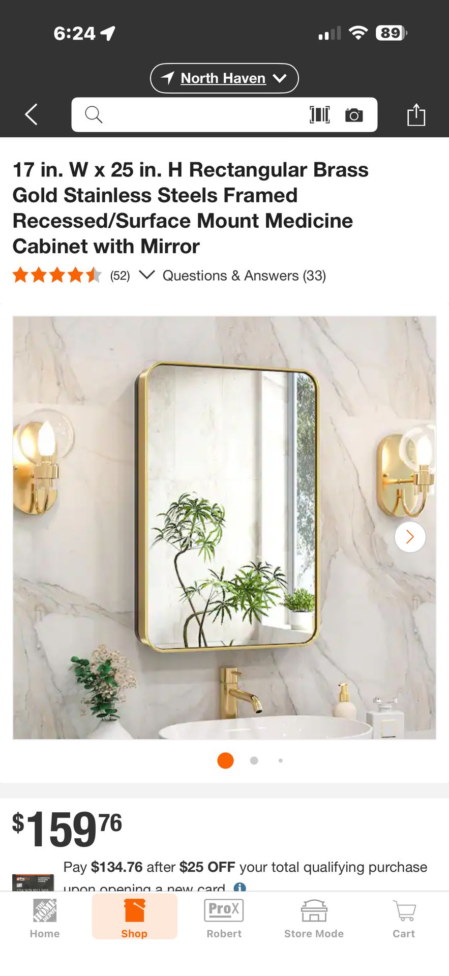 Brand new still in box 17 inches wide by 25 inches high rectangular brass gold medicine cabinet $125 at Home Depot asking $30