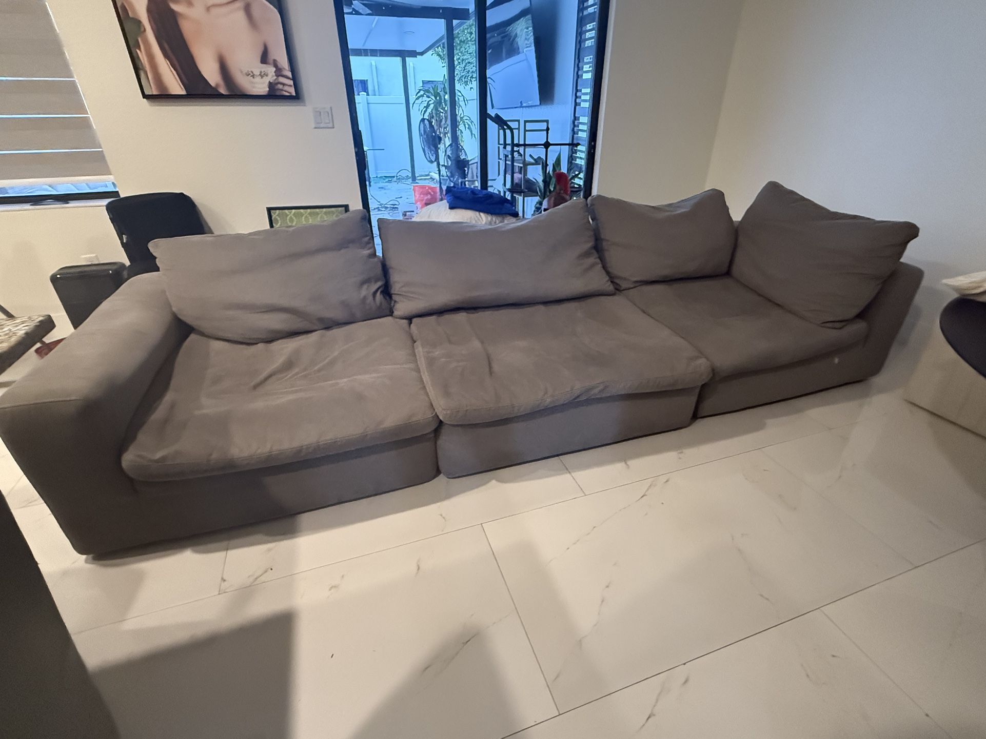 Super comfy City Furniture Nixon modular sofa, about 5 years old. Can be set up straight (133”) or in an L-shape. Right arm has a slouch from usage. • Modular pieces • Each piece approx. 44” W x 44” D • Feather-filled cushions – Cloud-style comfort • Cushions can be refilled to make fluffier • Neutral gray color Comfortable, deep seating and great for lounging. Pickup only.