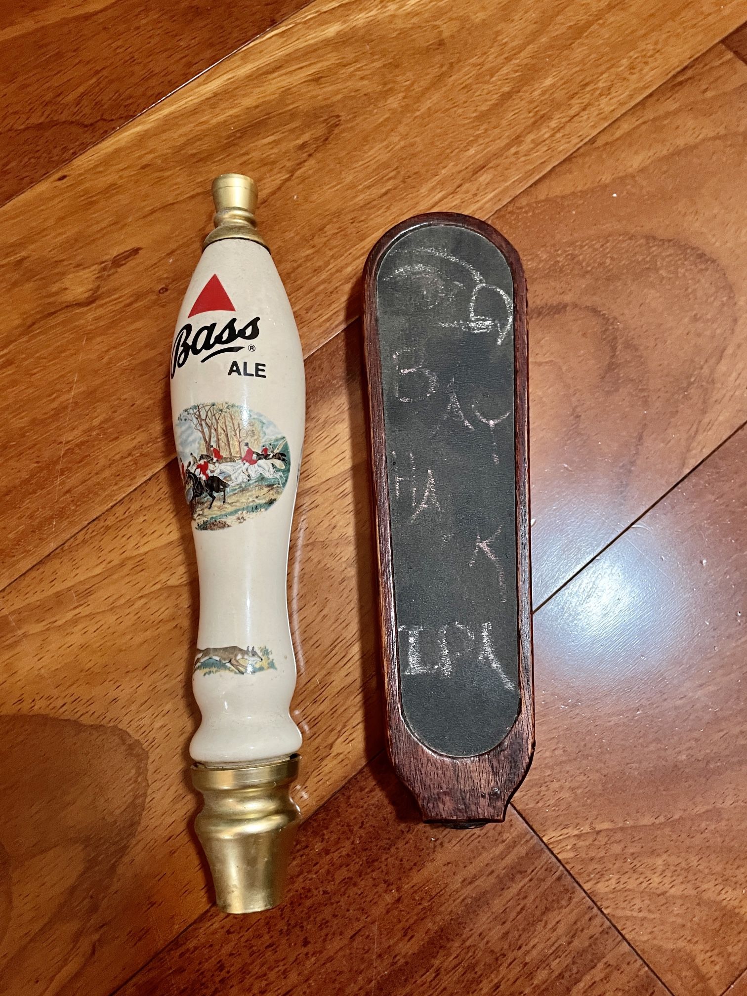 2 Tap Handles One is a Ceramic Bass Ale Handle and the other is a Chalkboard Handle that you can write the name of whatever beer you have on tap *** Beer Keg Kegerator