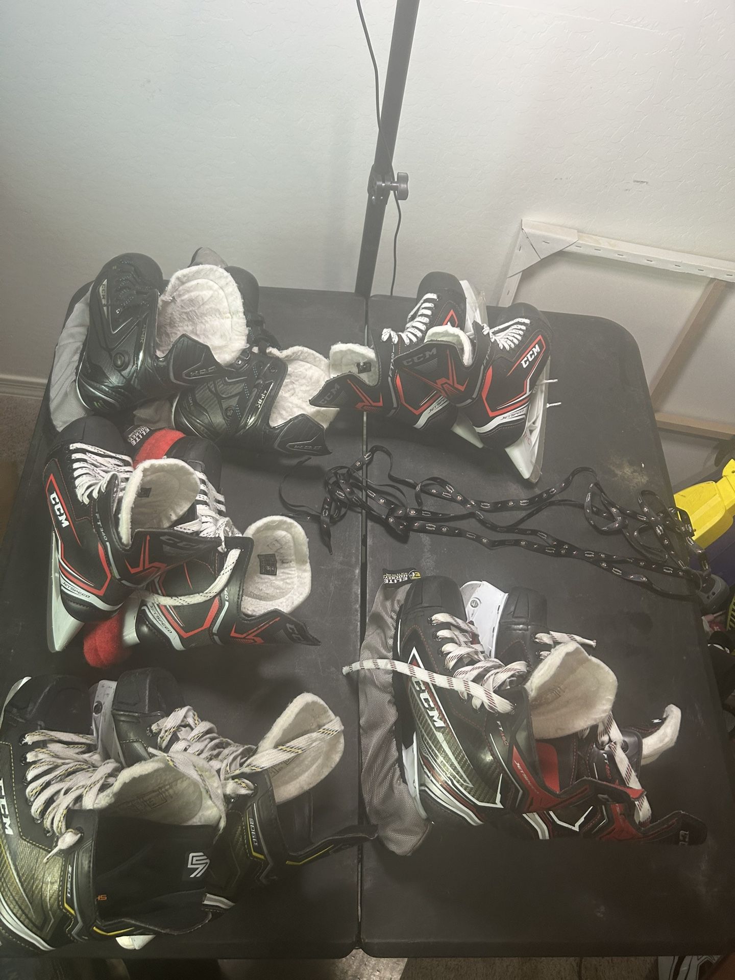 Four pairs of CCM hockey skates in good used condition. Perfect for players or practice use. And ice skate laces Selling all together for $120 or best offer — priced to sell fast! Pick up only cash only Need gone asap taking up room