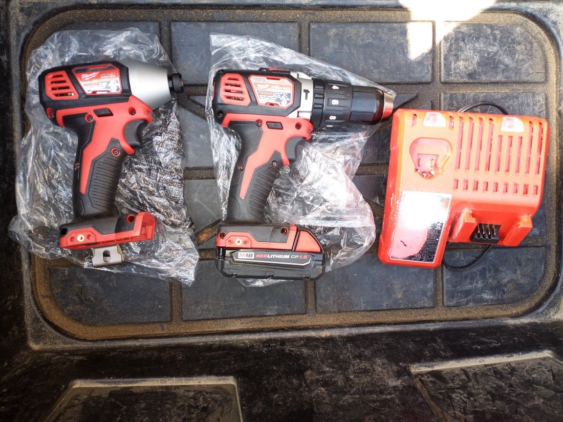 Milwaukee M18 18-Volt Lithium-Ion Cordless 1/2 in. Hammer Drill/M18 18-Volt Lithium-Ion Cordless 1/4 in. Hex Impact (1) 2ah Battery and charger