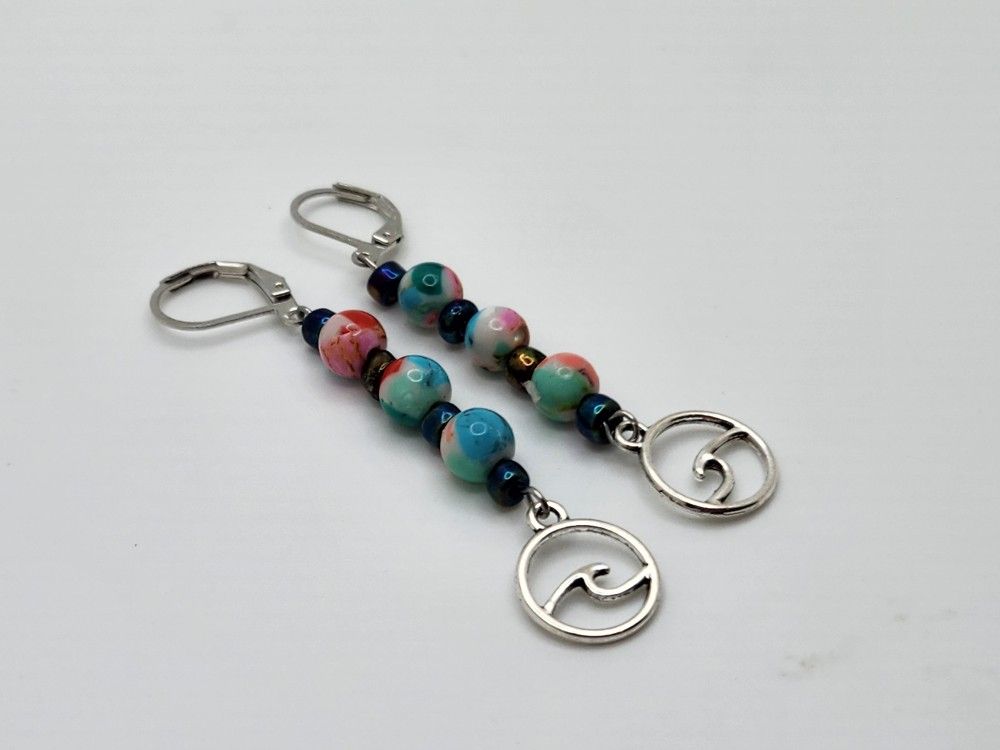 Pair of silver leverback earrings adorned with painted ceramic beads featuring ocean waves charms