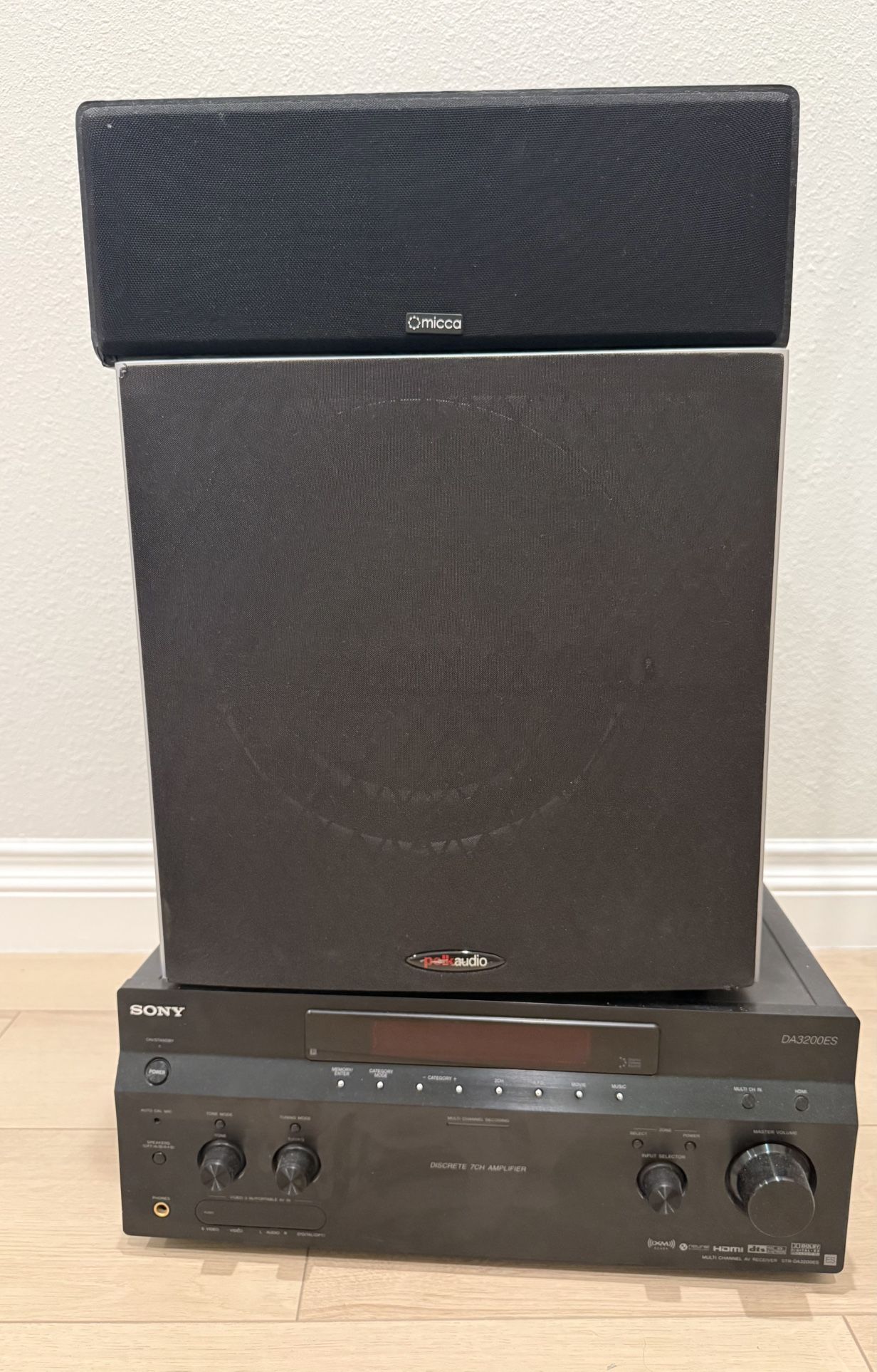 For $180….It Includes 1. SONY Receiver with remote and cables 1. Polk Subwoofer 1. Center speaker (Omicca) Pickup only from Cerritos area