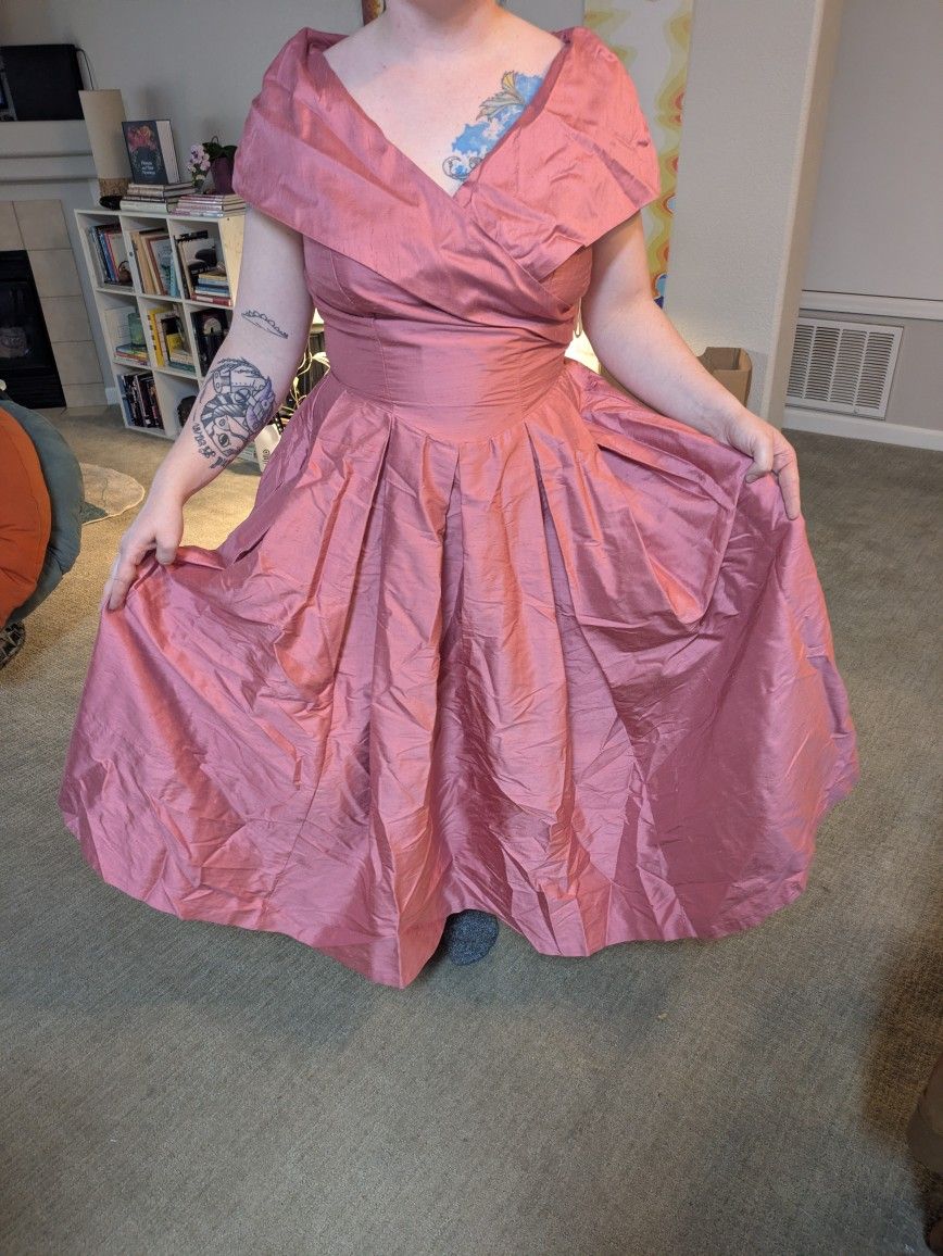 In need of a drycleaning/steam, but so beautiful! For reference, I'm usually a size 8 and it fits me like a glove. The outer layer is pure silk.