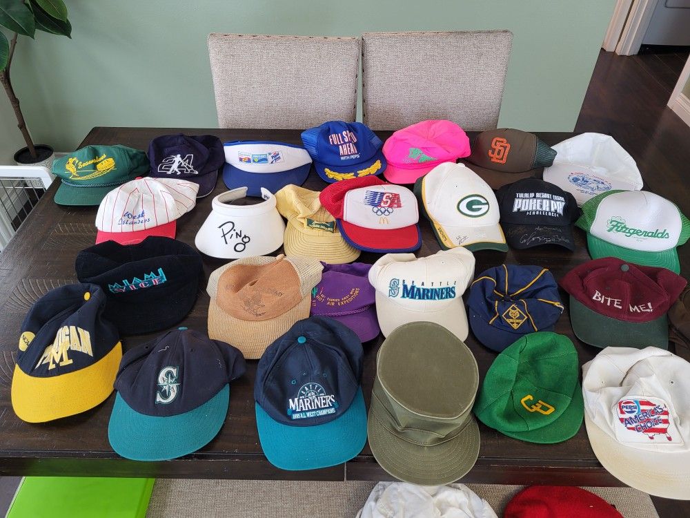 Mostly vintage hats in varying condition. 26 hats total. Passing $60 firm. The Packers had a signed by Terrence Murphy. I'm not sure who sign the poker challenge hat but I think these are pros that played in the local tournament years ago. The Miami vice corduroy is in great condition.