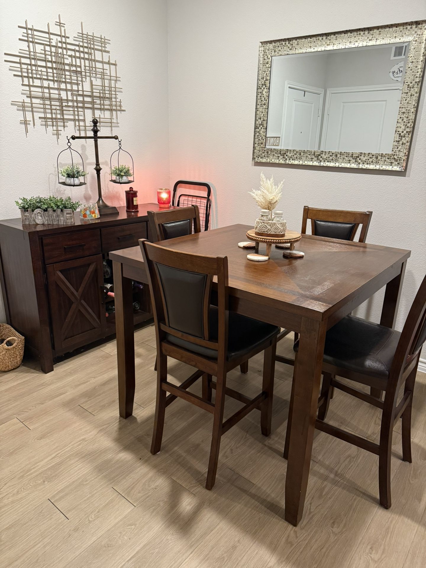 Solid wood 5 piece square table crafted with oak veneers in a rich brown finish The chairs' leather seat , with clean, soft curves and rounded edges are gently enhanced by tapered legs. Wine cabinet with three drawers and two cabinet doors feature metal hardware in black, with a hidden shelf built into the large cabinet. We can sell separately or together
