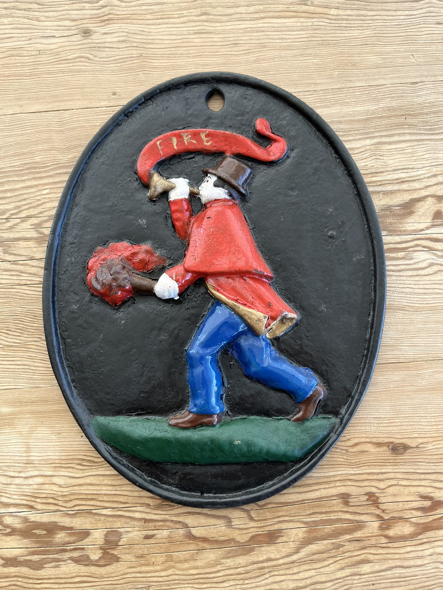 Virginia Metalcrafters Vintage Cast Iron Fire Mark with Fireman “Sounding the Alarm”