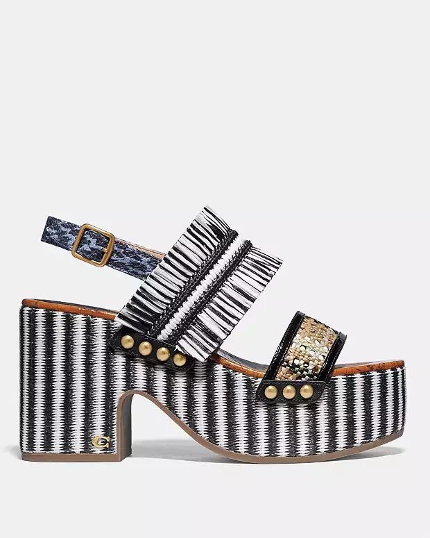 Coach Platform Sandals – Black/White Woven – Beaded & Studded Details Stand out in these gorgeous Coach platform sandals featuring a bold black-and-white woven design and unique mixed-texture straps. The front strap includes intricate beading, while the center strap showcases a fringe/ruffle detail for added flair. Finished with gold-tone studs and an adjustable buckle ankle strap for a secure fit. Details: • Brand: Coach • Style: Platform Sandal / Block Heel • Color: Black & White with Gold Accents • Features: Fringe strap, beaded strap, stud detailing, adjustable buckle • Condition: Like new wore once • Size: 8.5B Perfect statement shoes for summer outfits, vacations, festivals, or elevating any casual look.