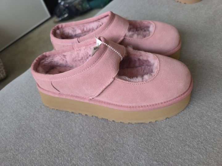 The product is a pair of UGG women's Mary Jane slide platform shoes in pink suede. With a comfortable platform design, these shoes are perfect for casual wear and feature the signature Mary Jane style. The US size 8 ensures a comfortable fit for the wearer, making them a trendy and comfortable choice for any woman's wardrobe.