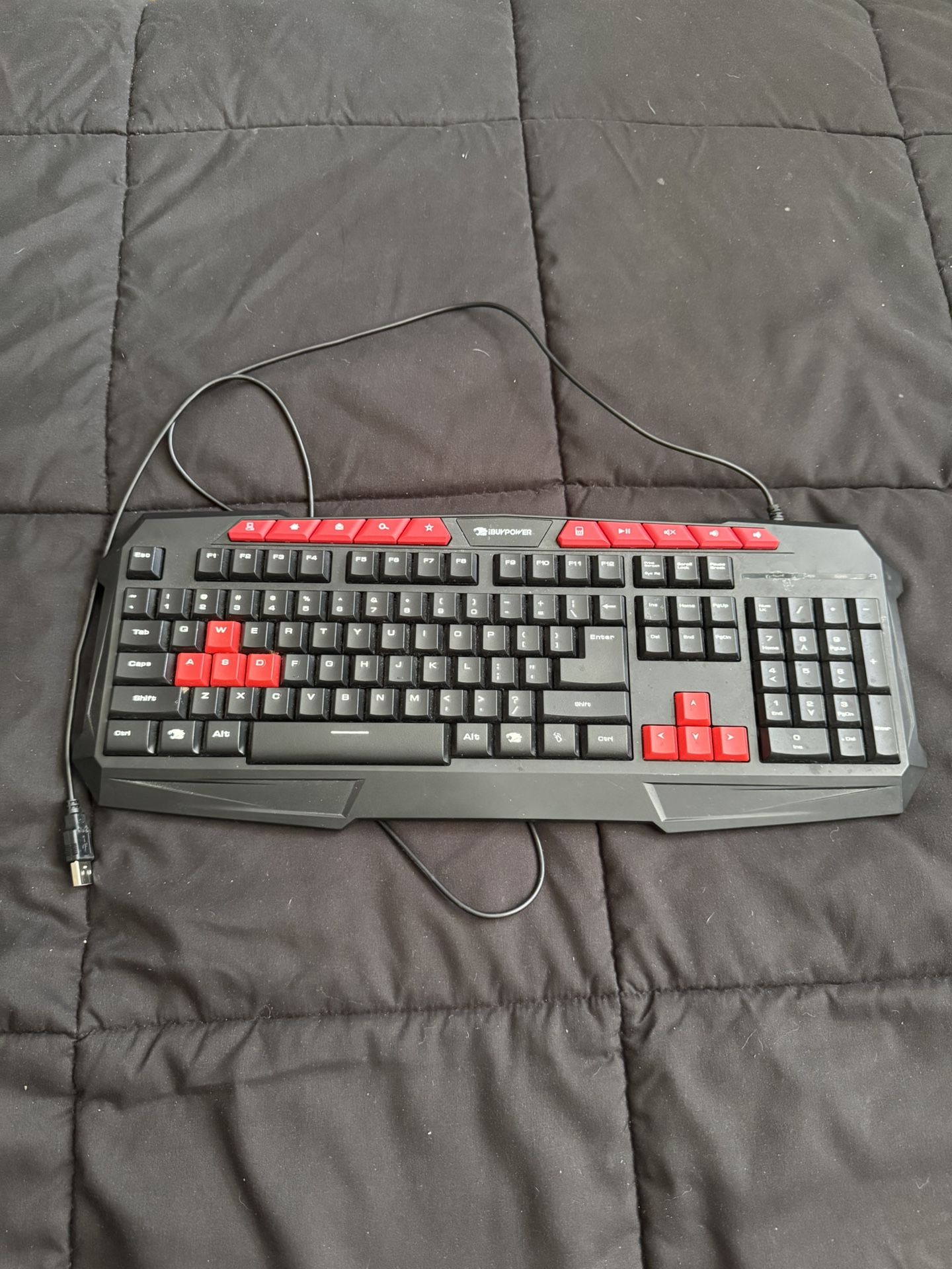 Lightly used iBUYPOWER gaming keyboard with red WASD/arrow keys. USB connection, plug-and-play. Works great — perfect for casual gaming or a backup setup.