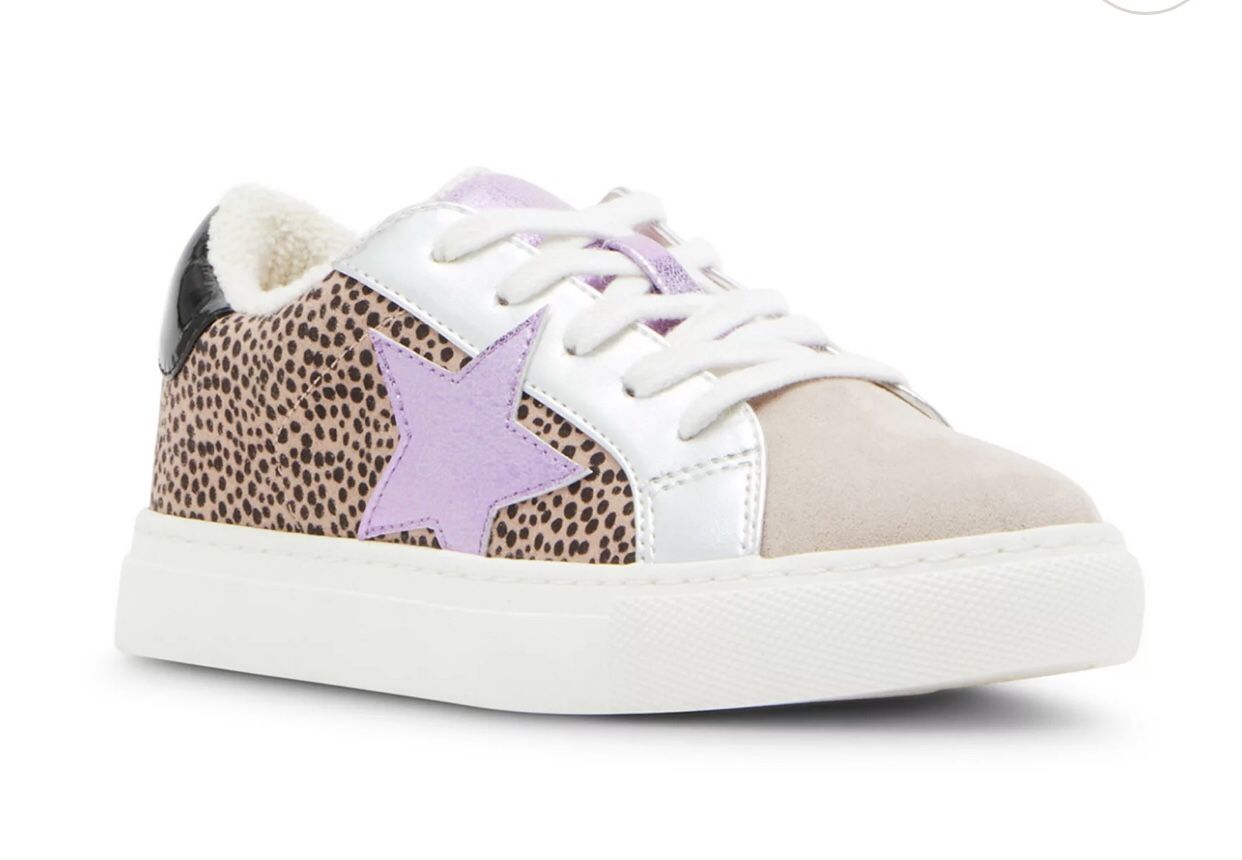 Cute big girl shoes feature cheetah print, metallic silver, black and big purple star . Sueded feel.