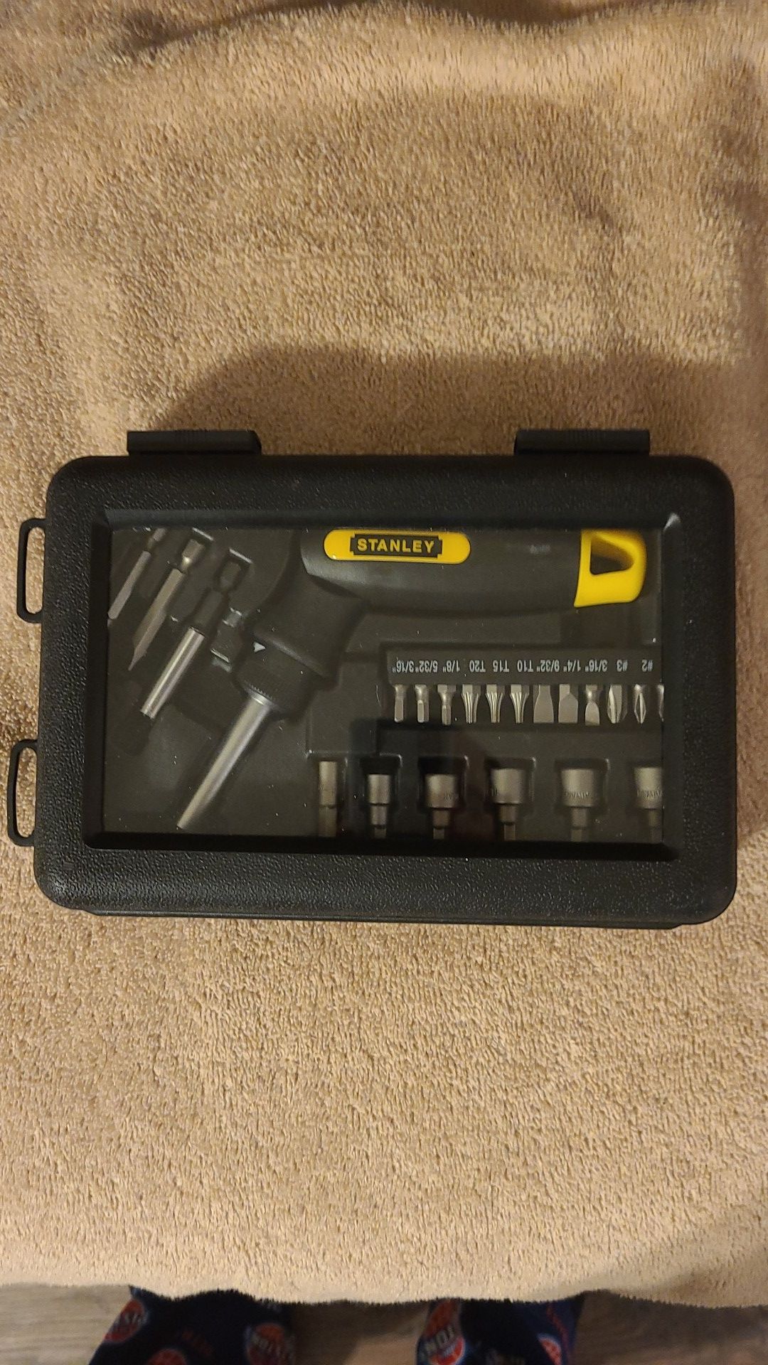 Stanley 22 peice pistol grip screw driver set has 3 Phillips head bits #1#2#3. 3 flat head bits 3/16 1/4 9/32. Has 1 t20 1 t15 1 t10 bits. Has 3 hex head bits 1/8 5/32 3/16 has 6 Rachel bits 7/16 3/8 11/32 5/16 1/4 3/16 has 1 2 1/4" extention bit and 1 2" Phillips bit 1 2" flat head bit. Plus pistol grip screw driver.