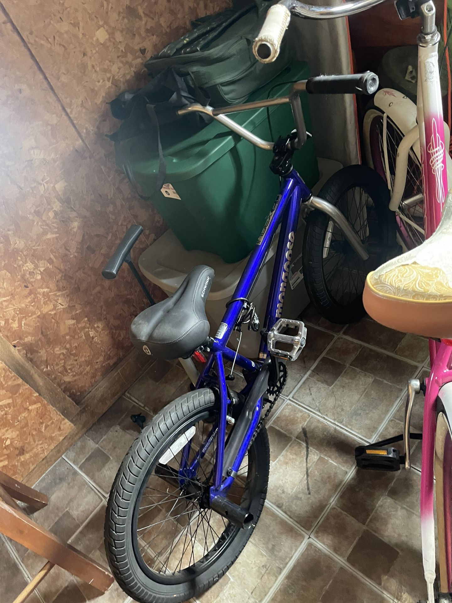 Willing to trade for either skateboards and skate parts or a complete stunt scooter. It is only the blue one in the picture. I cannot tell if the wheel has a hole in it or is just deflated It comes with a schwinn bike seat for commuting and the original one it came with. The bike lock will also come with it