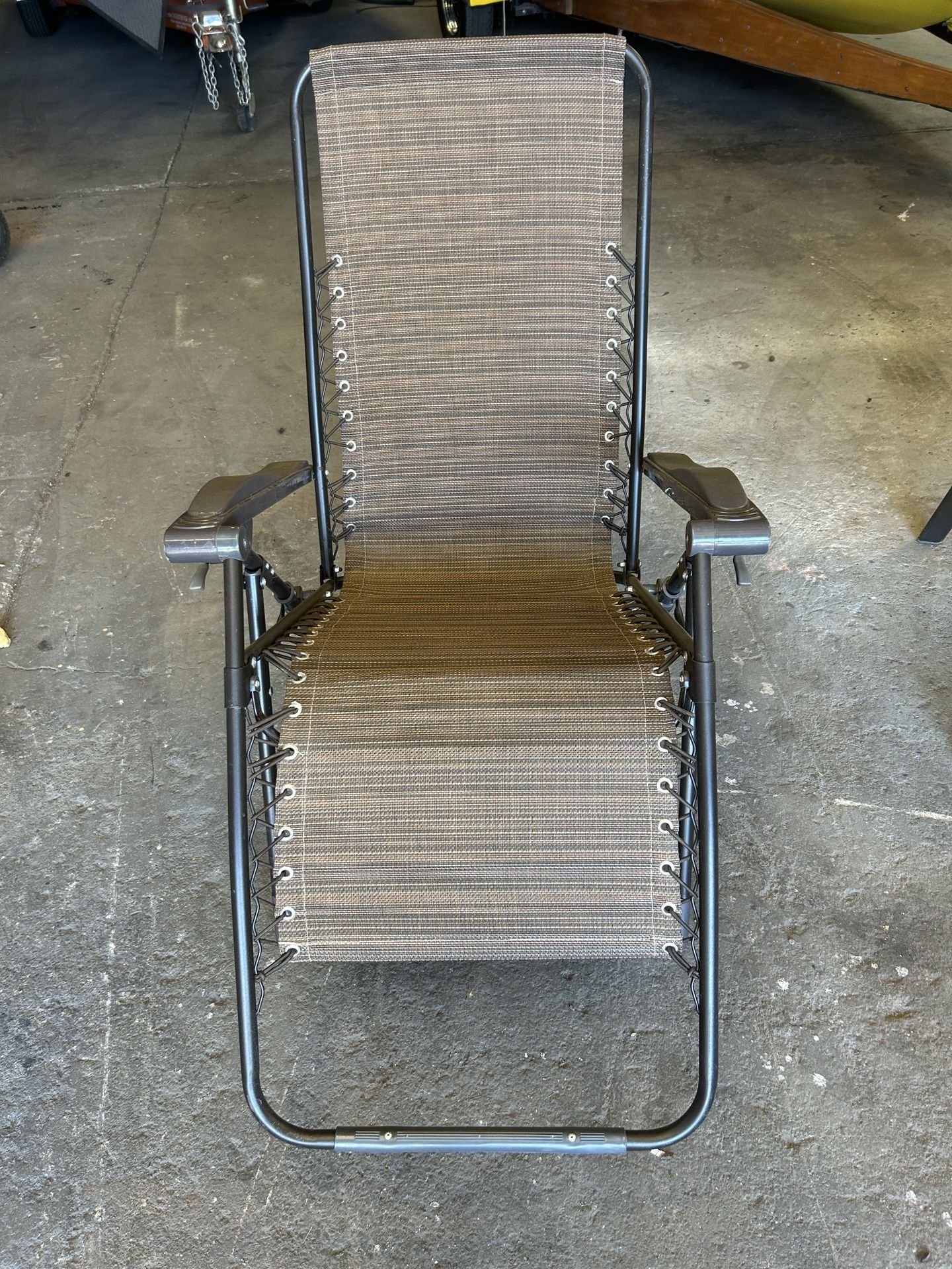 Like NEW SET OF 2 - Zero Gravity Folding Lounge Chairs Fully reclining lounge chair! Secure locking mechanism to lock your desired reclining position into place All-weather textilene fabric Heavy duty steel frame Fully foldable for easy storage and transporation Matte black powder coated frame finish No assembly required! P/u South Stockton