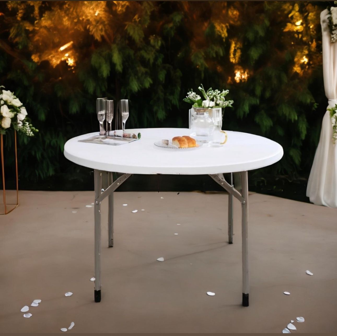 Brand new in box Plus tax More available COMMERCIAL GRADE: Indoor Outdoor round folding table with 48 inches round top perfect for any Hotel, party or socialization, whether you're hosting a backyard cocktail barbecue, or simply need extra seating at your next gathering. Stable enough to put heavy things sitting on top. 4-Foot Round Tabletop made from 45mm thick durable plastic this Bar Height Plastic table can seat up to 6 adults. The 29 inch height design is perfect for Banquet Table. The portable table features sturdy cross legs for added stability, and the smooth plastic top is easy to use, clean and maintain, water and stain resistant. Create an attractive surrounding with the stretch nylon covers on this table and use it for drinks or floral decoration. Its sleek design, construction, and practical features make it an excellent addition to any office, classroom, or conference room.