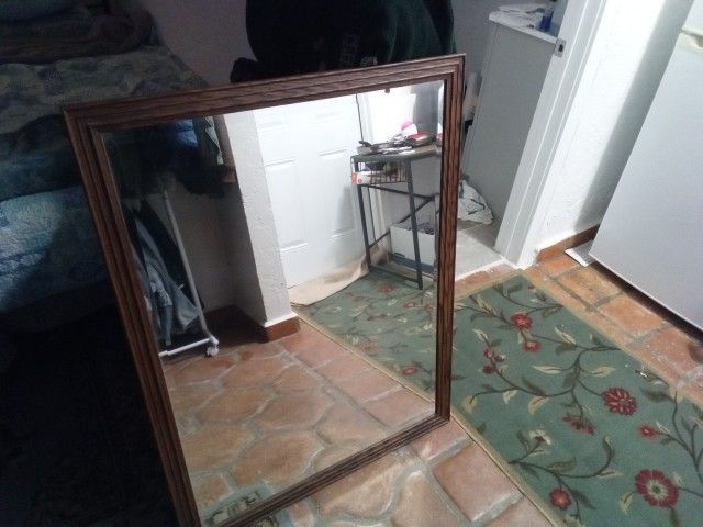 An old but near mint condition vintage wall mirror in a wood frame. Has 2 brackets for hanging on nails/screws long ways.