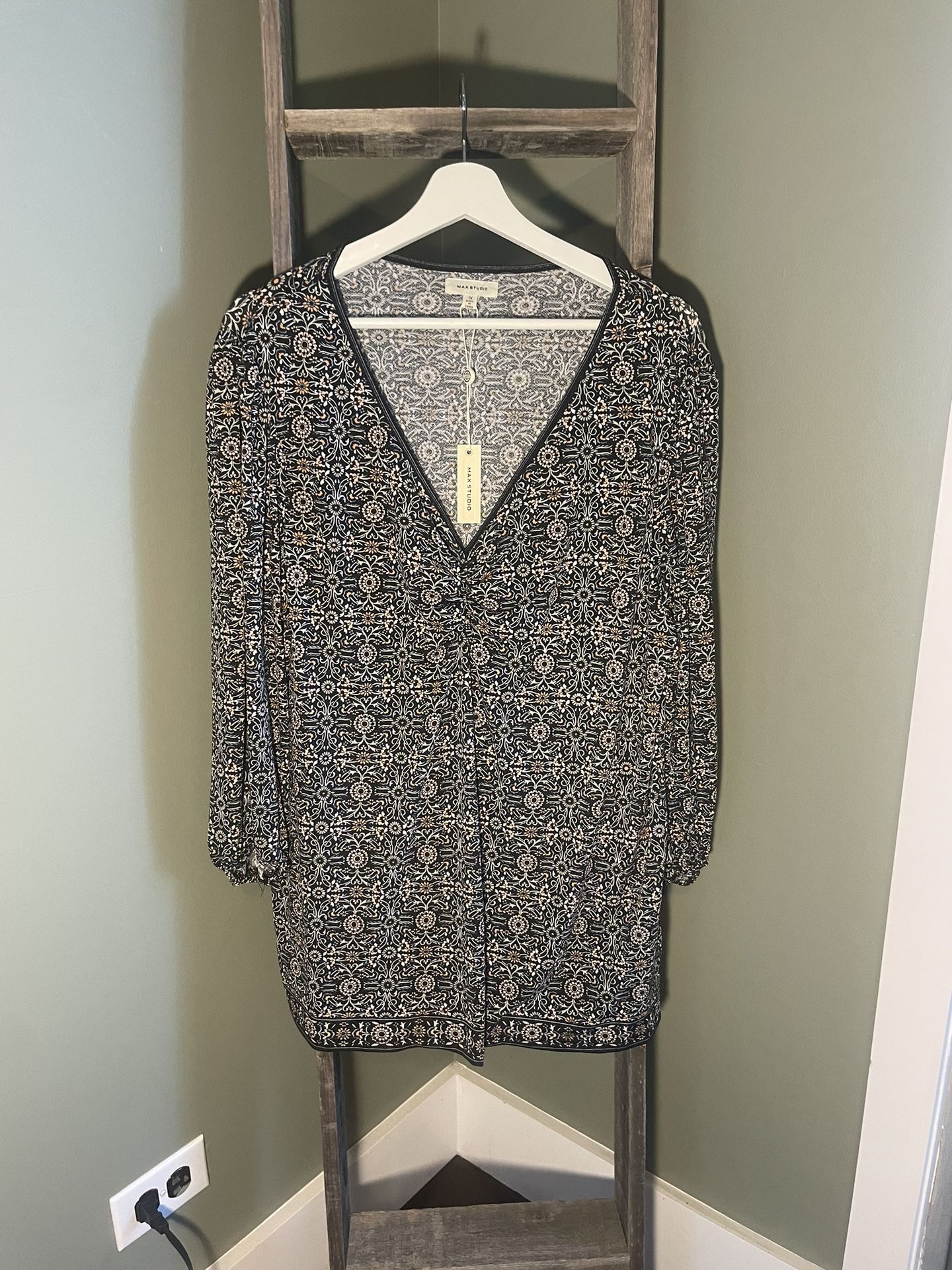 Adorable blouse from Max Studio with bust gather and v-neck. Tunic length with split hem and 3/4 length sleeves. Light weight material is perfect for year round wear, including summer! MSRP $98.