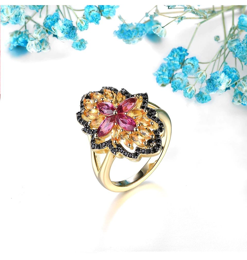 Elegant design ring genuine Gemstones Rhodolite Garnet Citrine Spinels High quality jewelry brand new Stamped 925 Natural Gemstone 14k gold over 925 sterling silver