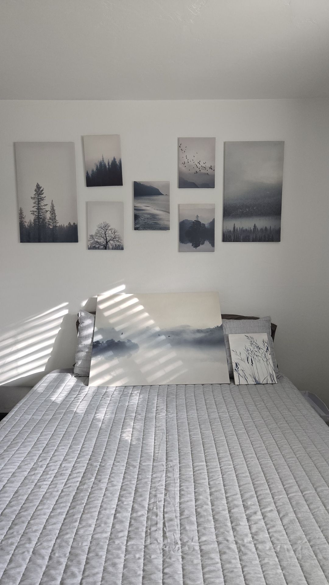 Peaceful cool-toned mountain lake themed wall art collection. Canvas on wood frames.