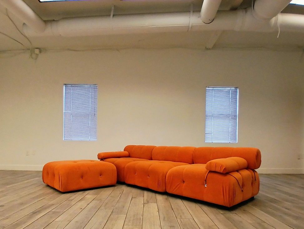 Modular sofa by Mario Bellini It comprises three large seating elements with backrests, along with one ottoman, all upholstered in original and nice Orange-colored fabric. This sofa is distinctive for its modular design, enabling flexible arrangements to cater to individual preferences and spaces. The set included : 3 x large : 74"D x 69"W x 51"H 1 x ottoman $1,200 Free Delivery is included to your home or space. Schedule appointment to see in person.