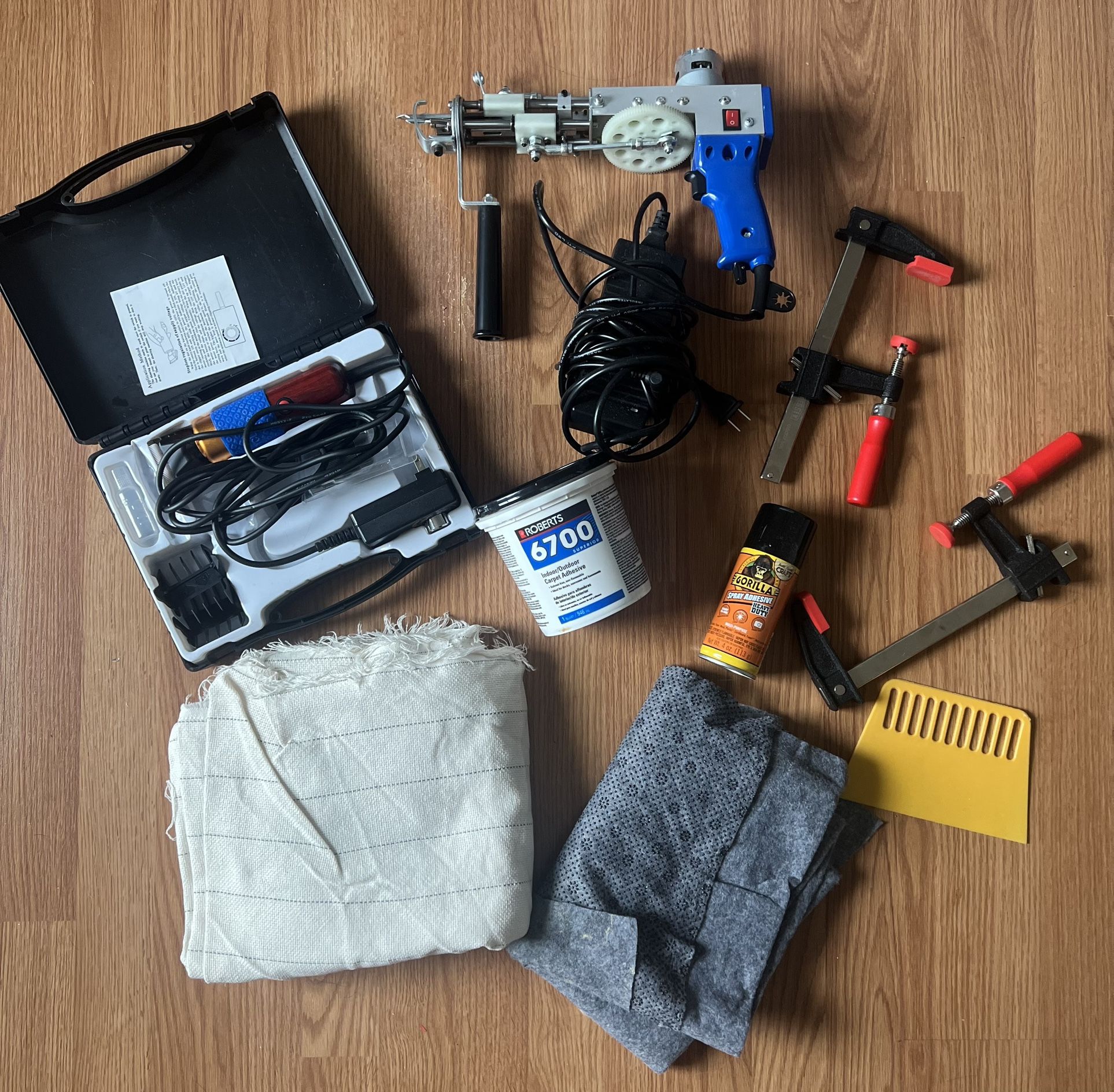 ⁃ Carpet trimmer kit includes: 200w rug trimmer, oil, 2 double-sided limit combs including 3mm, 6mm, 9mm, 12mm, ceramic replacement blade, tufting thread snips, cleaning brush, instructions for use, portable storage box. ⁃ Monk fabric and non slip fabric ⁃ Tufting gun ⁃ Roberts 6700 1 quart ⁃ Gorilla spray adhesive ⁃ Flat edge for glue spreading ⁃ Clamps to clamp frame to flat surfaces ⁃ Frame (30inx33in) Price negotiable: this is already a $500 value