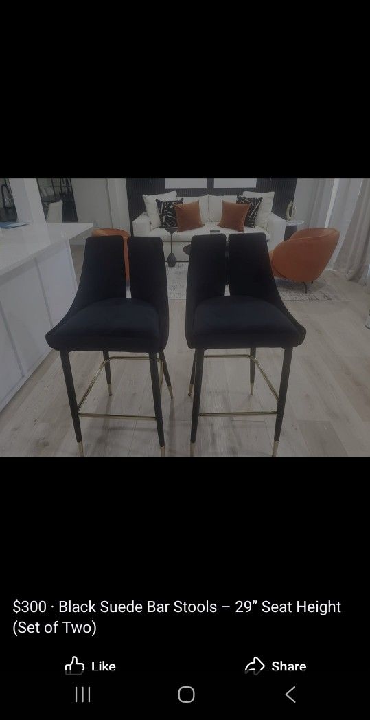 Two beautiful black suede bar stools in great condition. Price is for both stools. Comfortable, stylish, and perfect for a kitchen island or bar area. Seat height is approximately 29 inches from the floor. Clean and well maintained