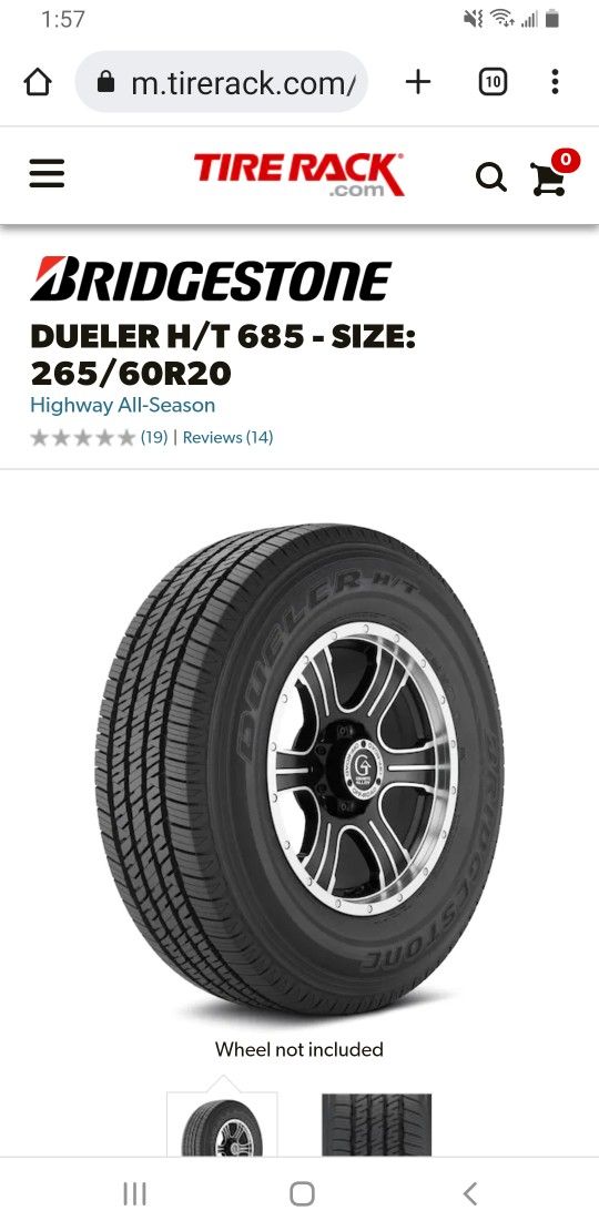 I have 4 new takoffs from my new Toyota Tundra. Bridgestone Dueler ht 265 60 r20 tires Retail for $328 each plus tax Asking $250 each Wheels sold separately