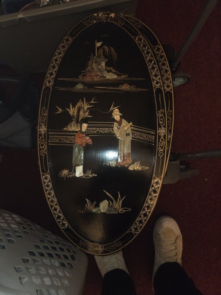 Vintage Oriental Mother Of Pearl Inlaid Black Lacquered Wall Plaque